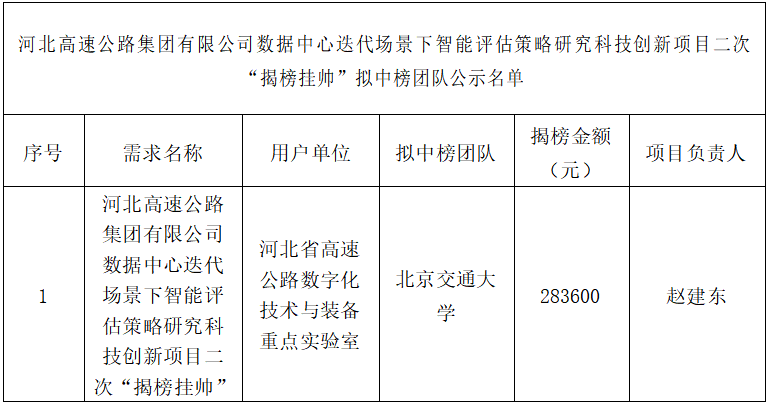 根据集团公司《河北高速公路集团有限公司关于修订〈科技创新项目“揭榜挂帅”管理办法〉和印发〈科技创新项目“揭榜挂帅”实施细则(试行)〉的通知》冀高创〔2024〕498号的要求,现将河北高速公路集团有限公司数据中心迭代场景下智能评估策略研究科技创新项目二次“揭榜挂帅”拟中榜团队名单进行公示。如有异议,请在公示期内将意见书面反馈至代理机构。