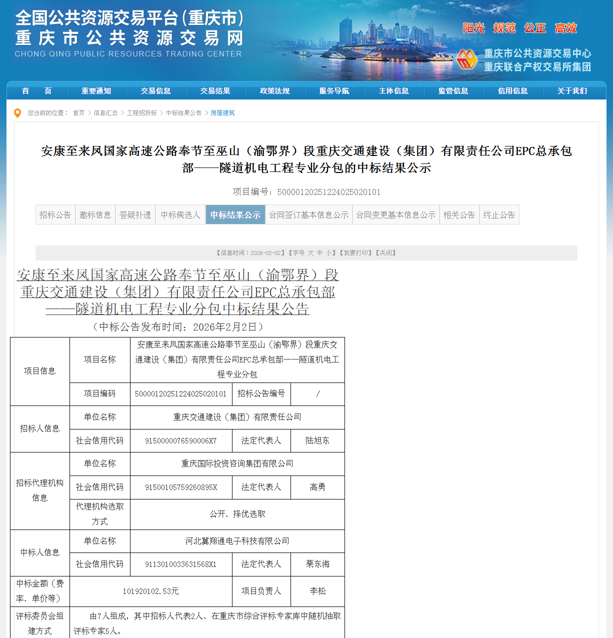 1月26日,重庆安康至来凤国家高速公路奉节至巫山(渝鄂界)段隧道机电工程专业分包项目正式开标,经过评审,冀翔通公司以1.019亿元成功中标该项目,这是冀翔通公司取得公路机电工程专业承包一级资质后中标的首个外省且金额突破亿元的重大项目,具有重大战略意义。